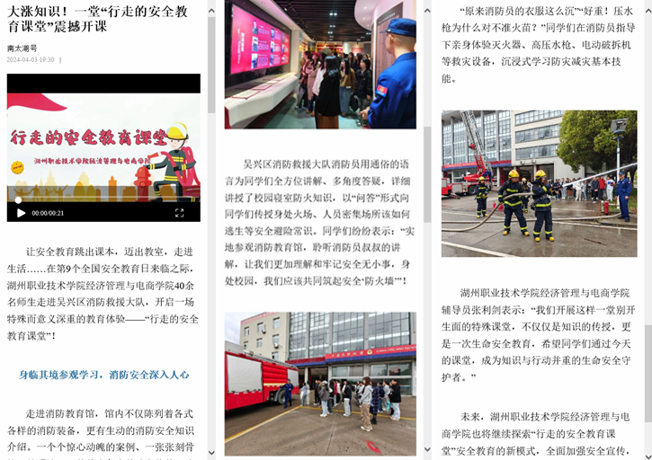 报道了我校师生走进吴兴区消防救援大队开启一场“行走的安全教育课堂”。