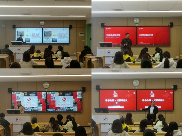 宣讲环节,四家企业代表依次登台,围绕企业文化、人才战略与职业发展路径展开分享。上海肯德基有限公司系统介绍了其标准化运营体系与“金字塔式”员工发展通道;海底捞重点阐释了“双手改变命运”的企业价值观与人才培育机制;鱼酷作为时尚餐饮品牌,展示了其年轻化定位与产品创新理念;上海申勤物业管理服务有限公司则从现代服务业角度,分析了物业管理领域的转型趋势与人才需求变化。